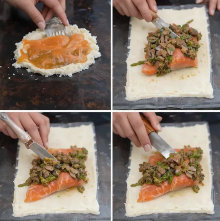 - Create the Base Layer: Spread the cooled mushroom and spinach mixture (duxelles) down the center of the pastry in a shape and size matching your salmon fillet. This acts as a moisture barrier and flavor bed.