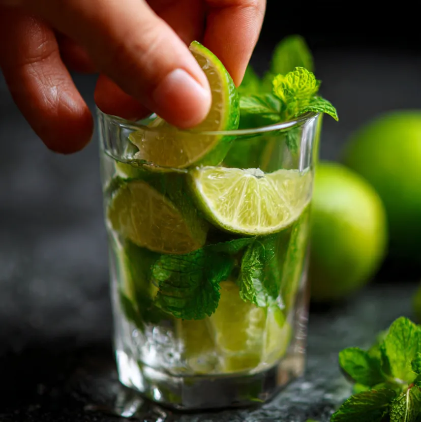 1. In a sturdy glass, combine the mint leaves and lime wedges.