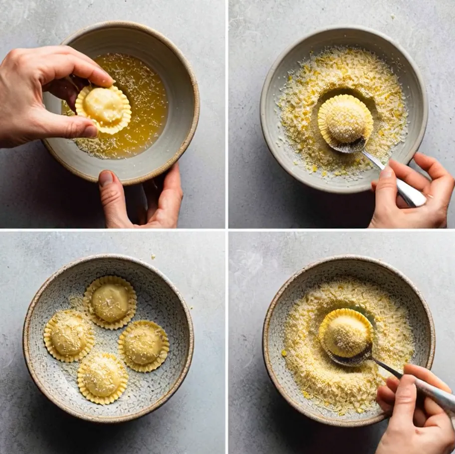- Place the breaded ravioli on a parchment-lined baking sheet or plate. Repeat until all ravioli are coated.