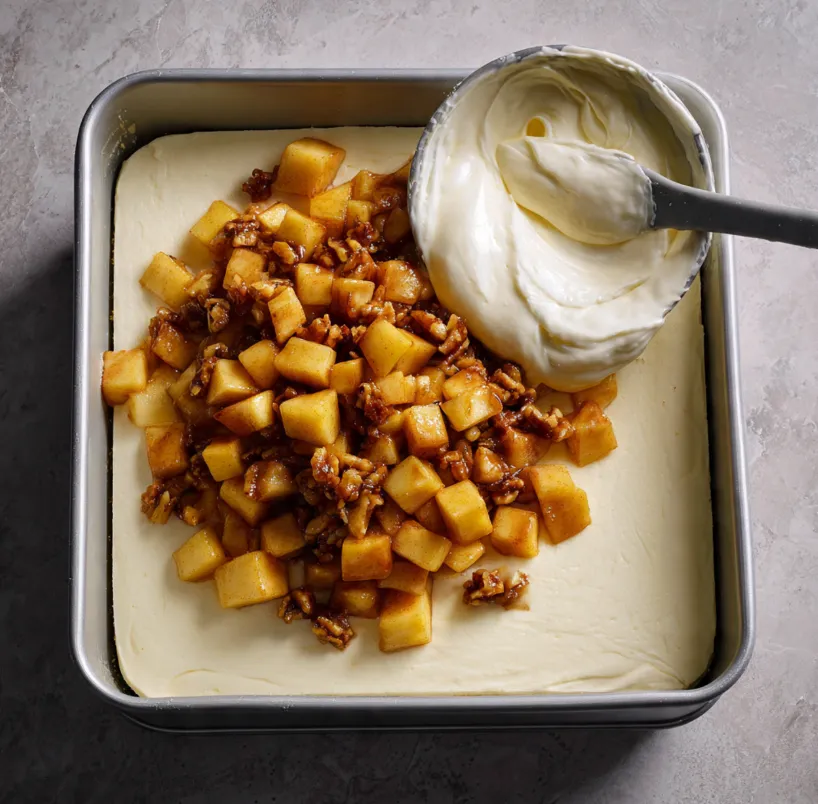 2. Evenly scatter the spiced apple pieces over the cheesecake layer.