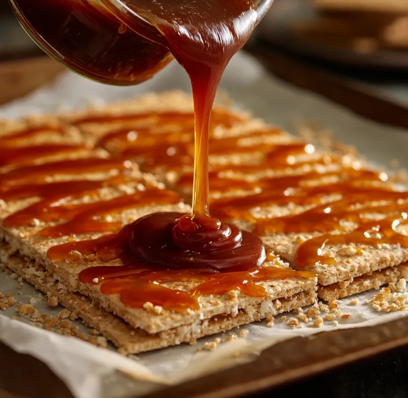 Immediately and carefully pour the hot toffee sauce evenly over the arranged saltine crackers. Use your spatula to gently spread it to cover all the crackers. Quickly place the pan in the preheated oven and bake for 5 minutes. The toffee will be bubbly and spread across the crackers.