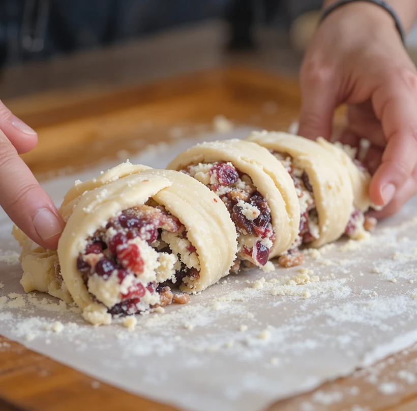 Using an offset spatula or the back of a spoon, spread the cranberry-feta filling evenly over the entire surface of the dough, leaving about a 1/2-inch border along one of the longer edges (this will help seal the roll).
