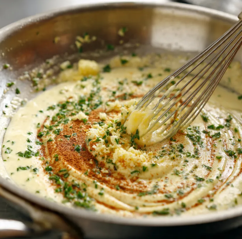 - Gradually whisk in the grated Parmesan cheese until the sauce is smooth and slightly thickened. Stir in the fresh parsley, thyme, and rosemary. Taste and adjust seasoning if needed.