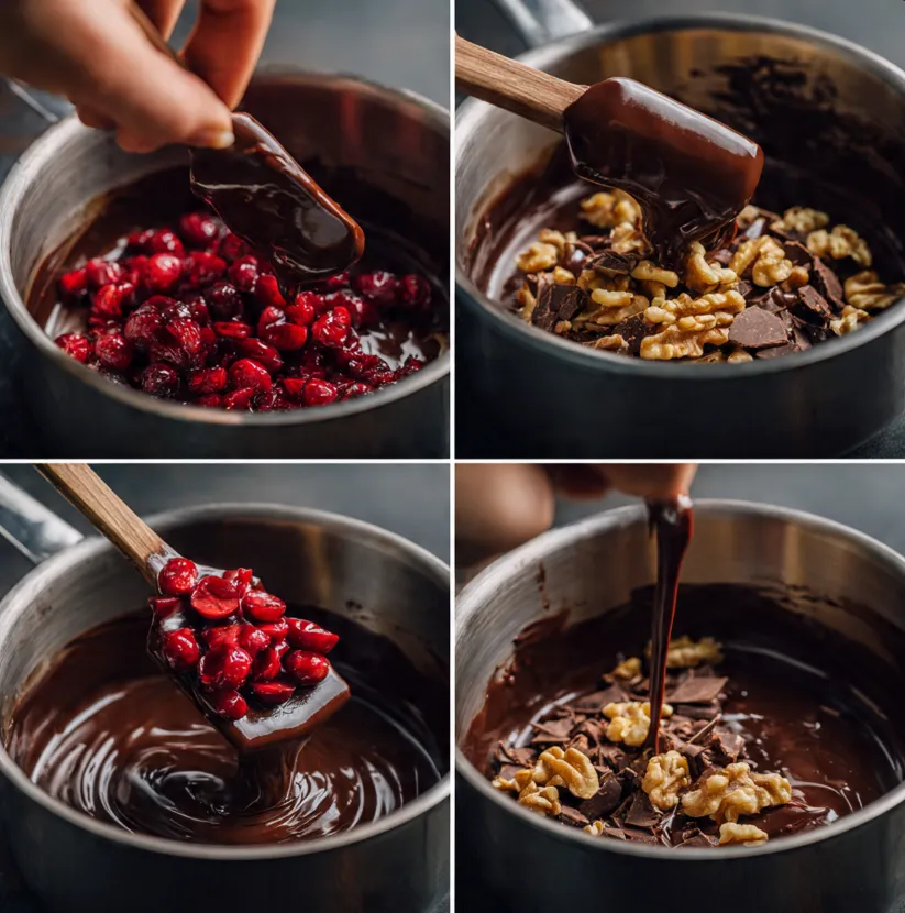 Once smooth, remove the saucepan from the heat immediately. Stir in the vanilla extract and the pinch of salt. Now, gently fold in the prepared chopped maraschino cherries and toasted walnuts. Reserve a small handful of each for sprinkling on top, if desired. Fold until the add-ins are evenly distributed throughout the rich chocolate mixture.