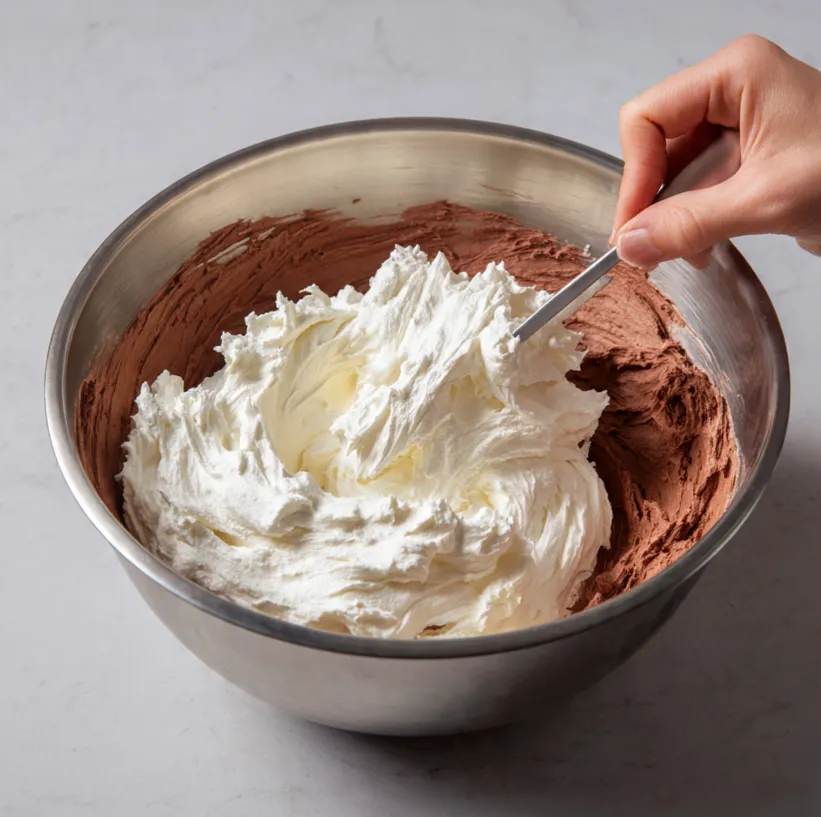 Gently fold about one-third of the whipped cream into the chocolate cream cheese mixture using a spatula. This lightens the dense mixture. Once incorporated, carefully fold in the remaining whipped cream until no white streaks remain. Be gentle to keep the filling airy and light.