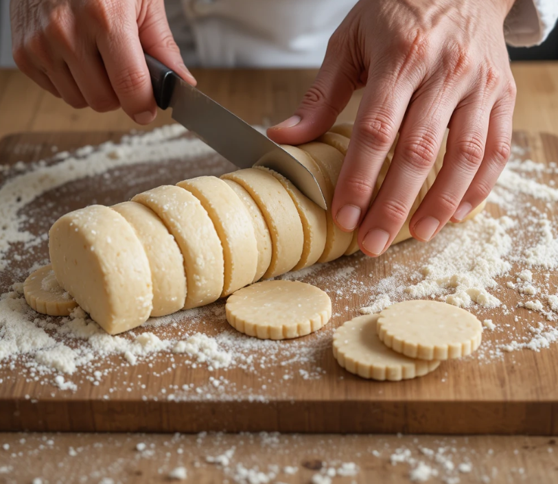 - Slice the Dough:Â Remove one dough log from the fridge. Using a sharp, thin-bladed knife, slice the log into rounds just under 1/4-inch (about 5mm) thick. Aim for uniform thickness so they bake evenly. If the dough cracks, let it warm up for 5-10 minutes.