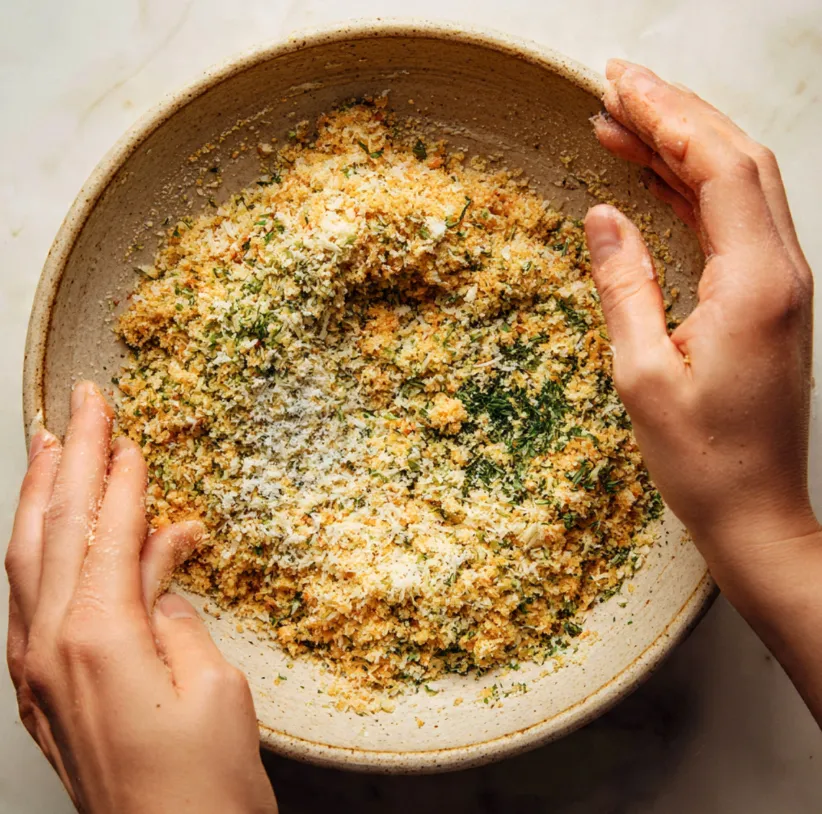 In a medium bowl, combine all the crust ingredients: the grated Parmesan, Panko breadcrumbs, melted butter, chopped parsley, chopped dill, minced garlic, lemon zest, and paprika. Use a fork to mix everything until it’s well combined and resembles a coarse, damp sand. The butter (or oil) acts as the glue that holds the crust together and helps it turn golden brown.