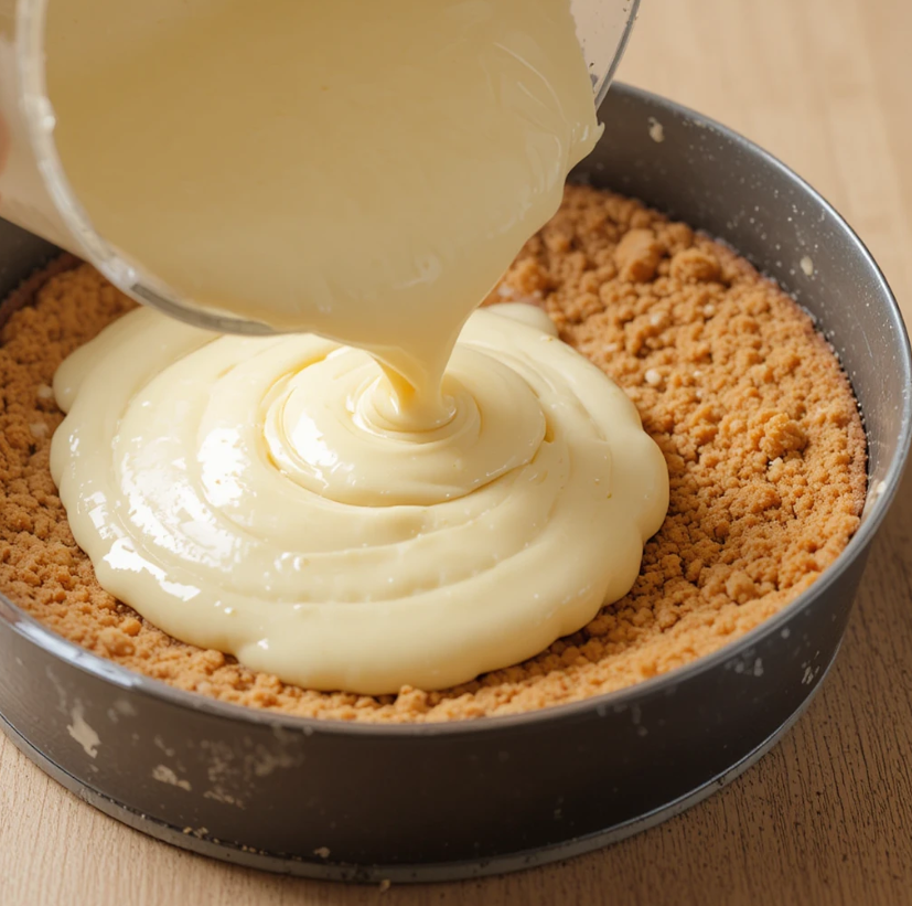 5. Pour the filling over the cooled crust and smooth the top with an offset spatula.