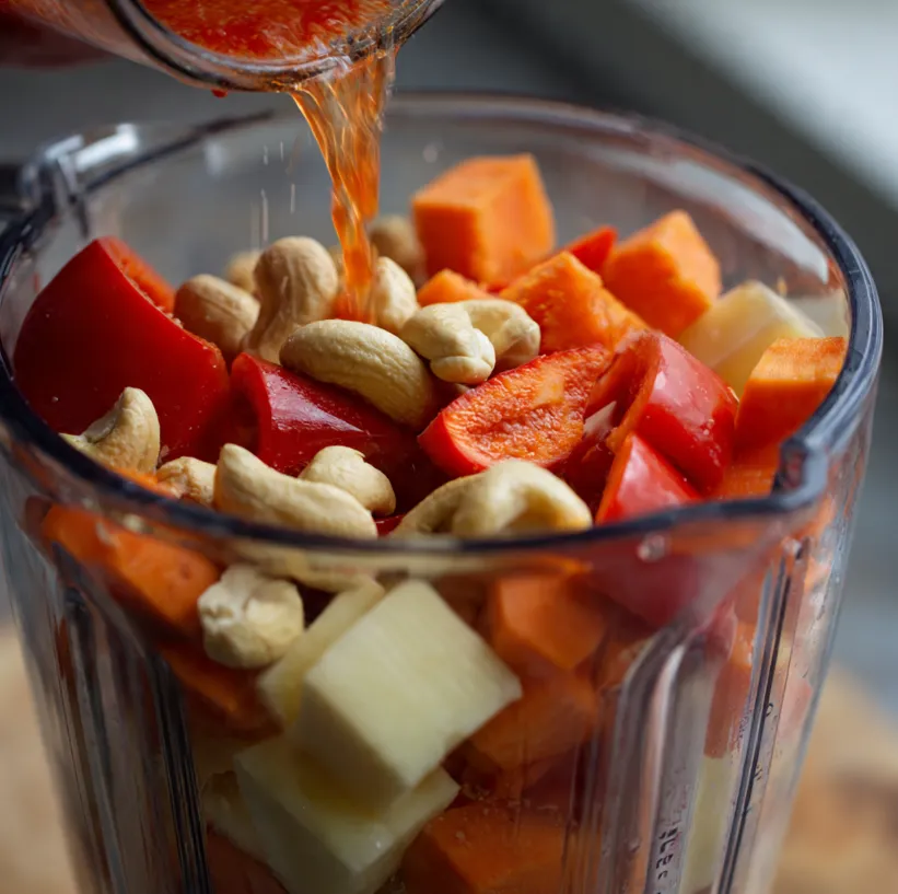 - In a high-speed blender, combine the roasted bell pepper, cooked potato and carrot, soaked cashews, nutritional yeast, lemon juice, miso paste, and all spices (smoked paprika, garlic powder, onion powder, turmeric, cayenne).