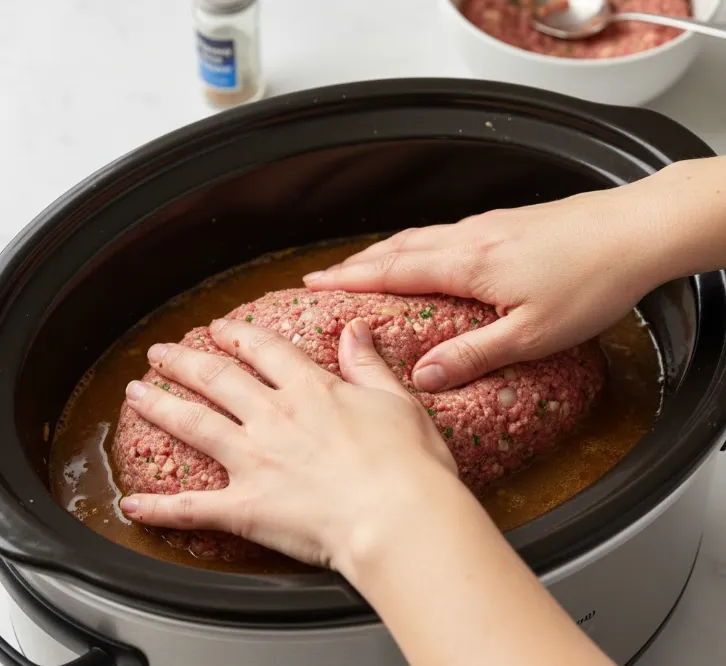Transfer the meat mixture to the prepared slow cooker. Shape it into a firm, oval loaf that sits nicely in the center of the cooker, not touching the sides if possible. This allows the heat and steam to circulate evenly.