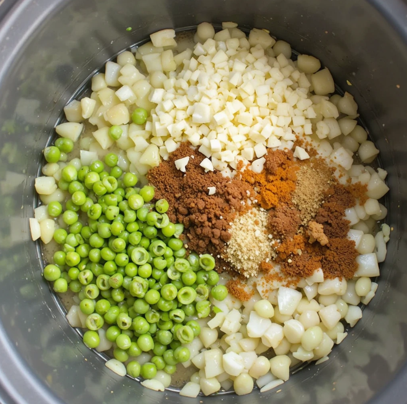Transfer the sautéed onion and spice mixture to the slow cooker with the beans. If you skipped sautéing, simply add all the chopped onion, garlic, tomato paste, and spices directly to the pot. Pour in the water or broth and give everything a good stir. The liquid should cover the beans by about an inch.