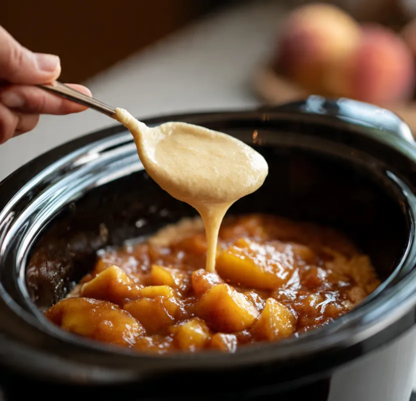 - Carefully pour the batter over the peach layer in the slow cooker. Use a spatula to spread it gently, but don’t worry if the peaches peek through in some spots.
