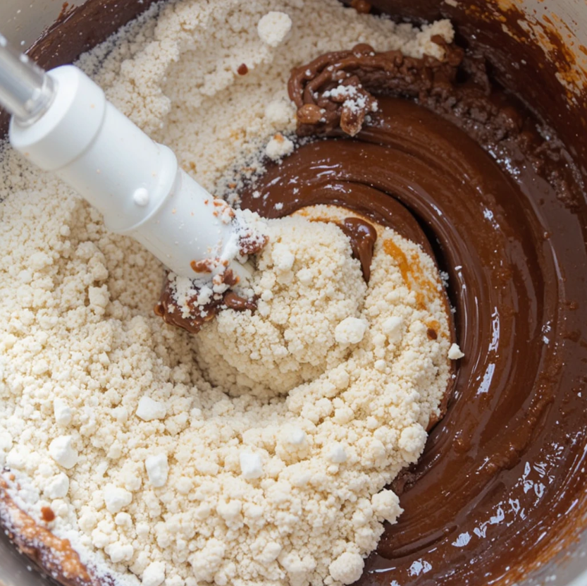 With the mixer running on low speed, slowly pour the wet ingredient mixture into the dry ingredients. Mix just until the batter is smooth and uniform. It will be quite thin—this is normal and correct for an ultra-moist cake.