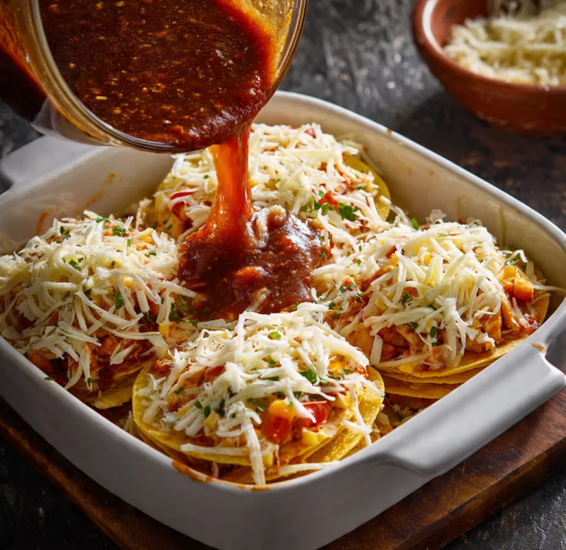 - Final Top Layer: Place a final layer of tortillas on top. Pour the remaining 1 cup of enchilada sauce over them, making sure to cover the edges to prevent drying. Sprinkle the final 1 cup of cheese generously over the top.
