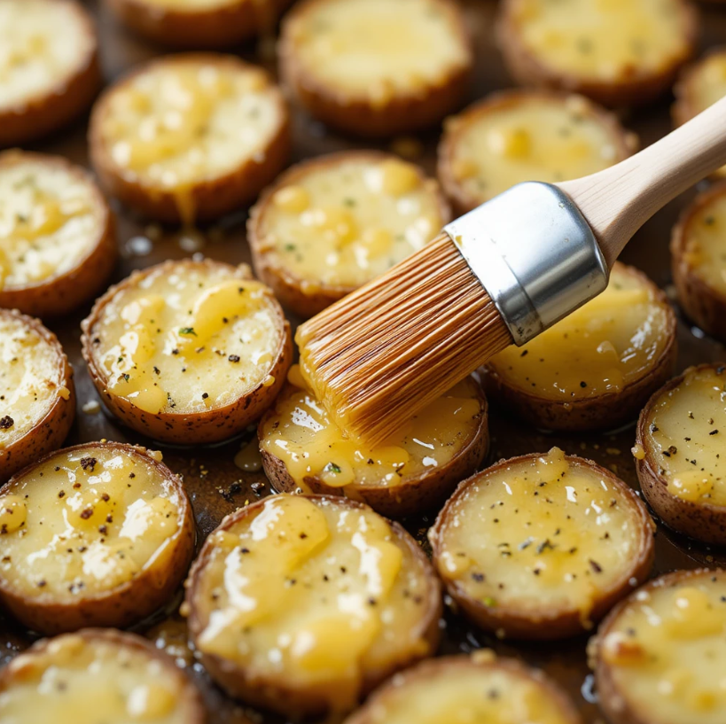 - Brush Generously:Â Place the sliced potatoes on a baking sheet lined with parchment paper (for easy cleanup). Use a pastry brush to generously coat each potato with the garlic-herb butter mixture, making sure to get in between the slices as much as possible. Reserve about 2 tablespoons of the butter mixture for later.