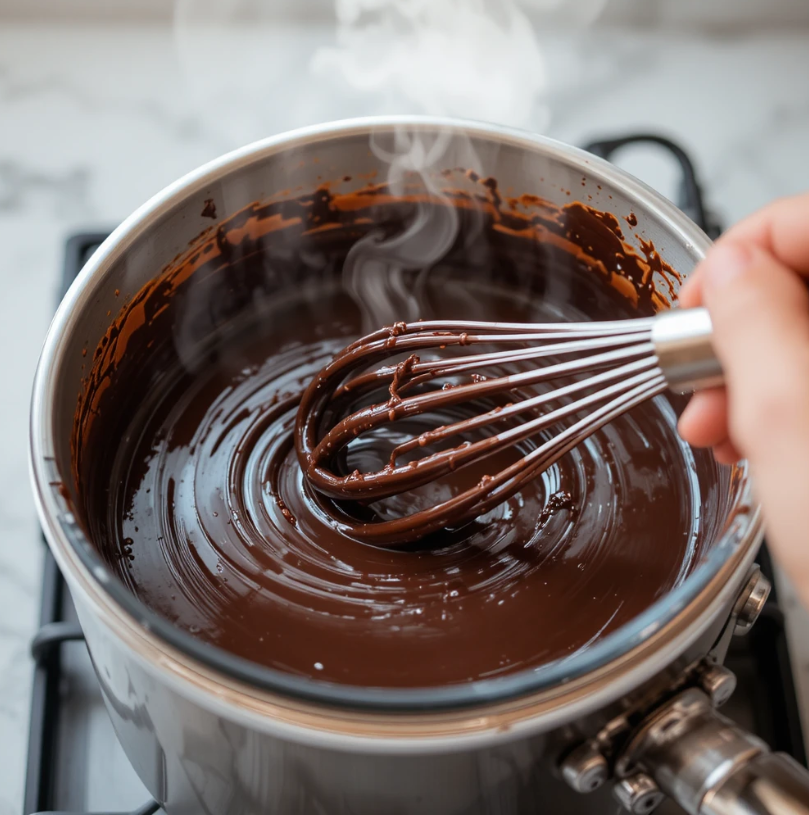 - Immediately whisk this hot custard into the melted chocolate mixture until fully combined and smooth. Set aside.